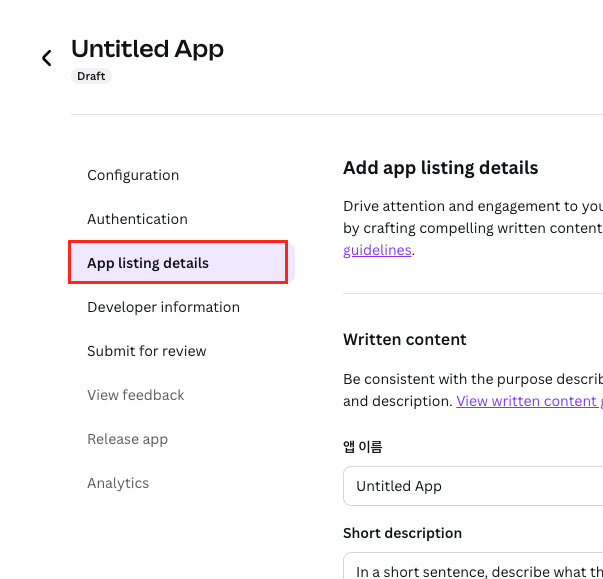 이 메뉴에서 앱에 대한 정보와 이미지들을 올려야 합니다.