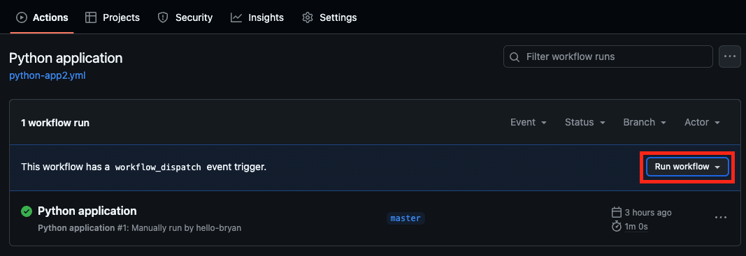workflow 파일에 ( 예를들면 python-app.yml ) `workflow_dispatch:` 를 추가하면 됩니다.