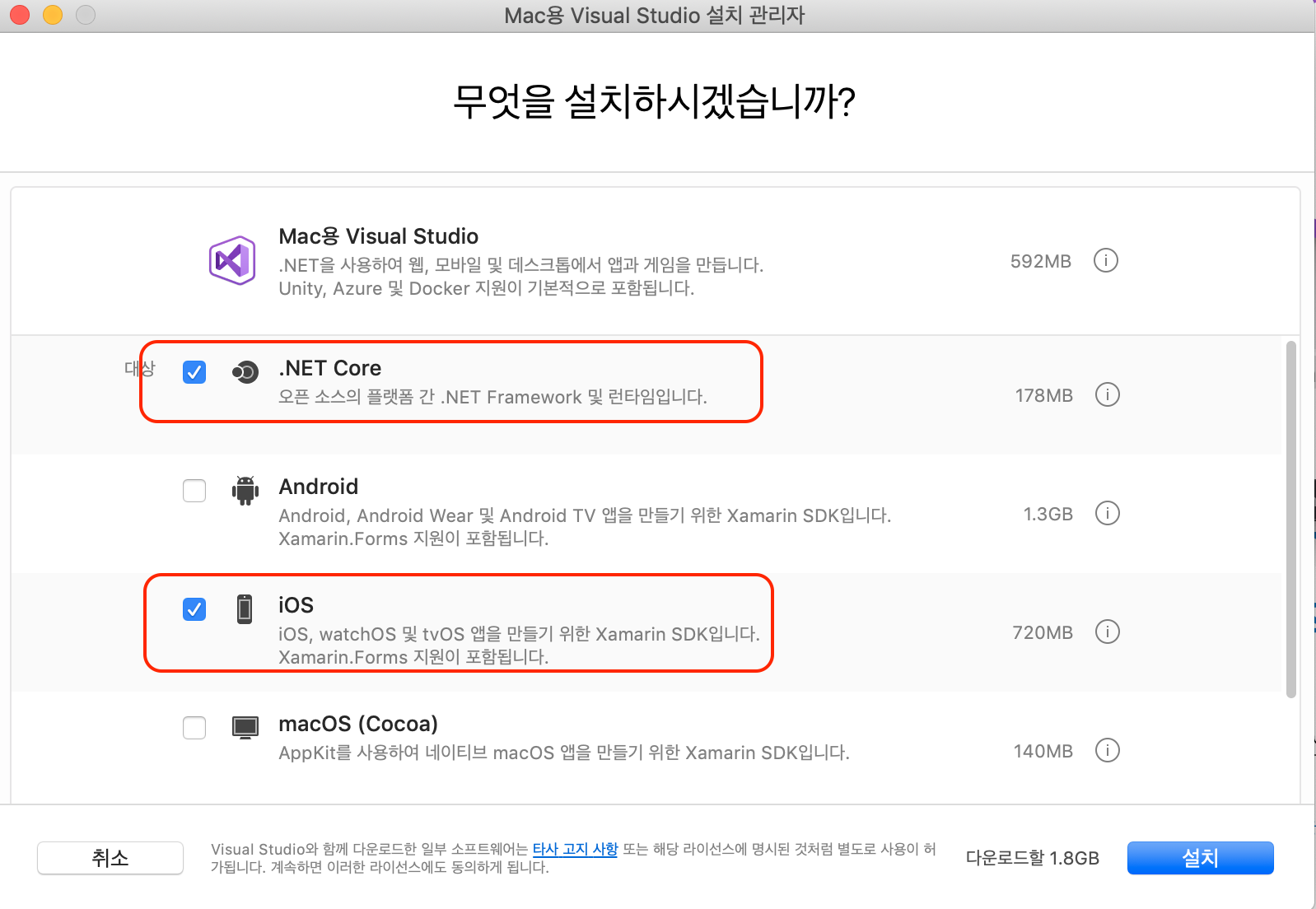 .NET Core는 있어야하고, 그 아래로 안드로이드,IOS,MacOS 중 개발하려는 플렛폼을 선택합니다.