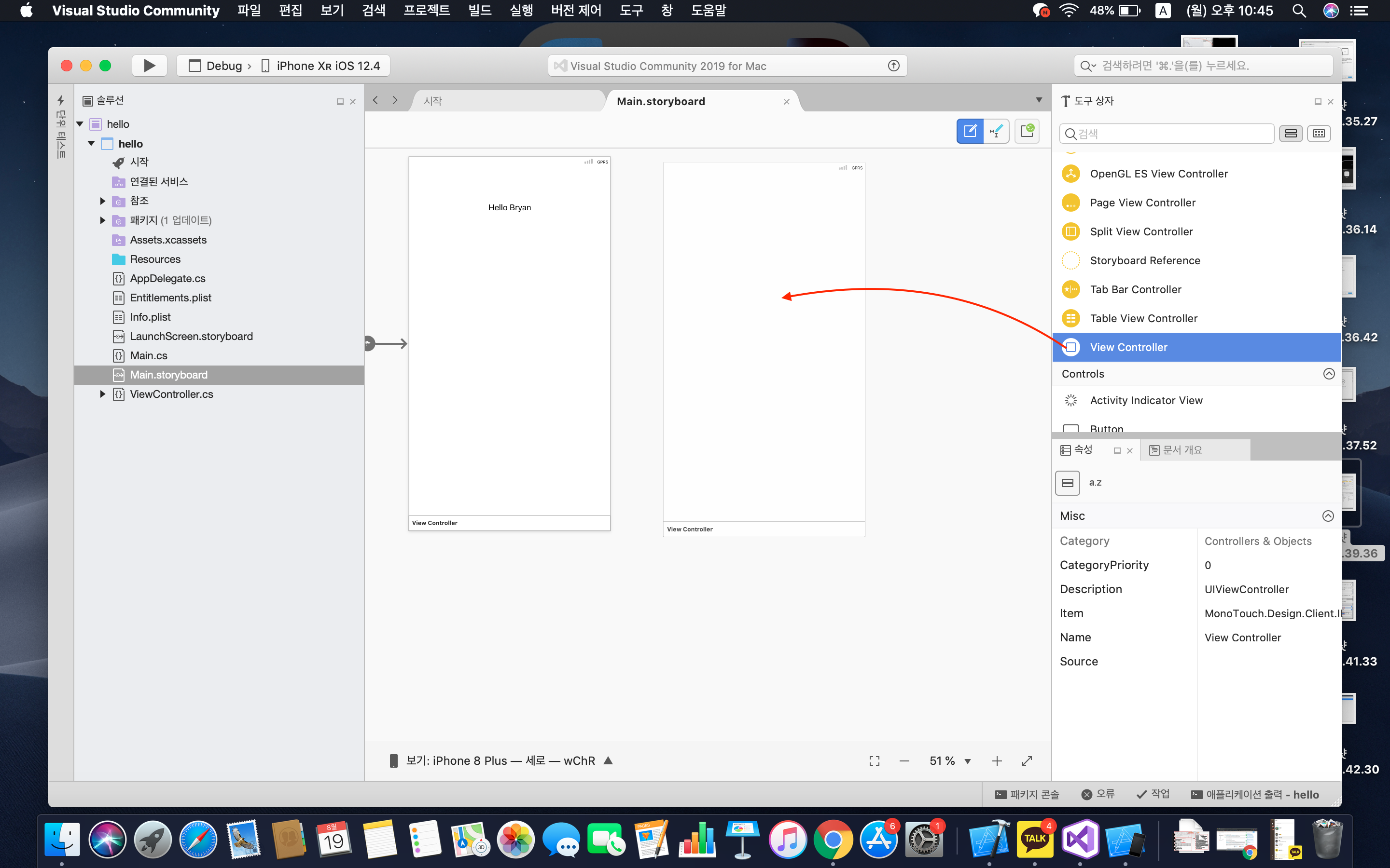 드래그 드랍 하여 Main Storyboard에 끌어 놓습니다.