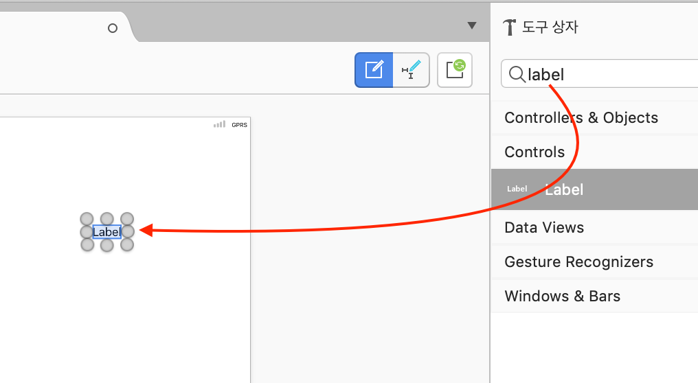 우측 상단에 도구상자를 보면 Label 이 있습니다. (검색 창에 Label을 입력해도 됩니다.)