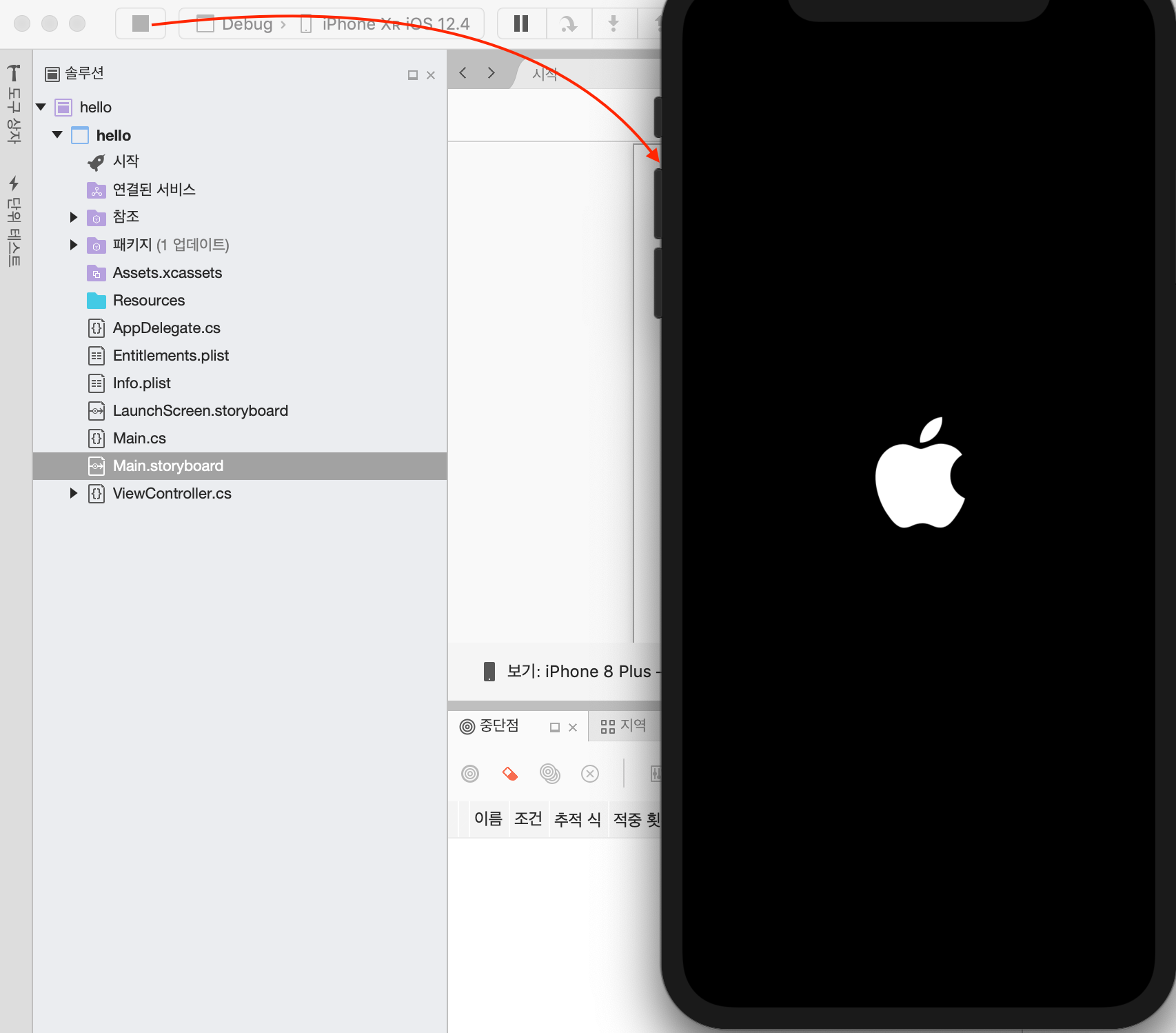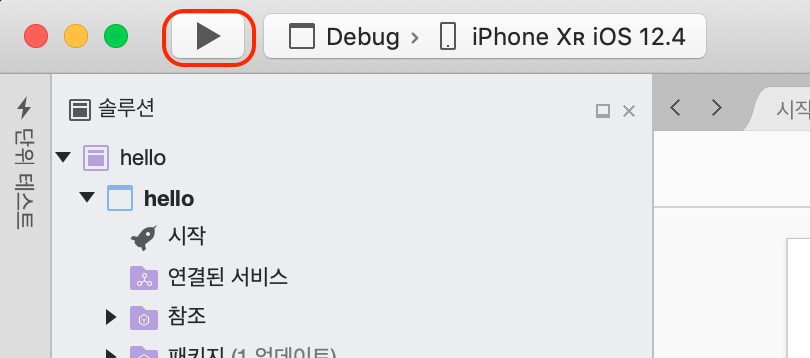 일단 실행 해봅니다. 시뮬레이터를 선택하고 ▶︎ 버튼을 누르면 시뮬레이터가 실행됩니다.