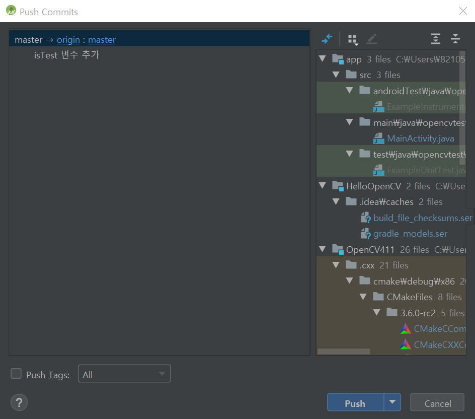 이 버튼을 누르면 Commit 을 하고 git 서버에 push 합니다.