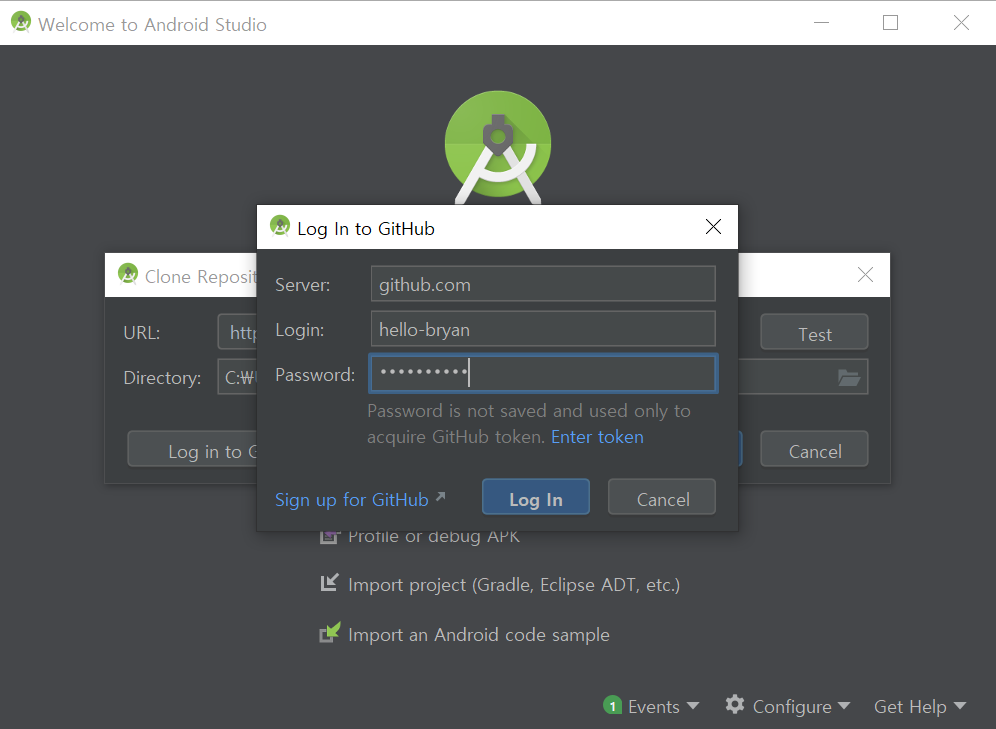 Log in to GitHub... 버튼을 클릭하고 로그인 다이알로그에서 로그인합니다.