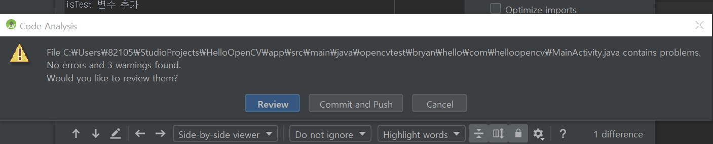 Commit and Push 전에 warning 이나 TODO 주석이 있으면 경고창이 나옵니다.