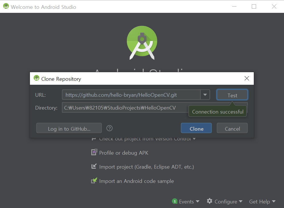아래와 같은 창이 뜨면 URL 란에 Git 의 url 을 복붙 합니다. 그리고 Test 를 누르면 connection successful 이라고 나옵니다.