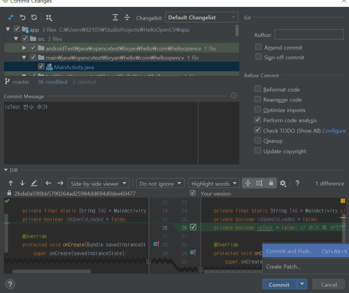 하단의 Commit 옆에 화살표를 누르면 Commit and Push 버튼이 나옵니다.