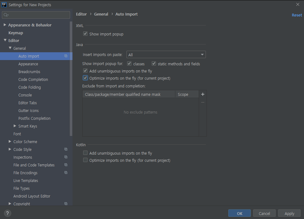 코드에서 Import 를 자동으로 해주기 위한 옵션설정입니다.