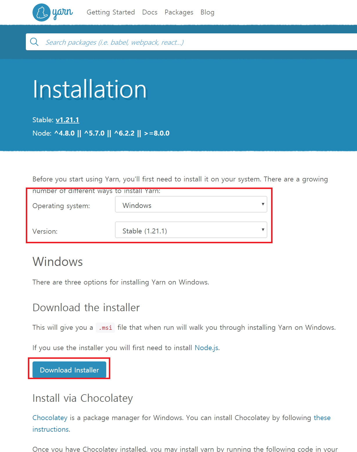 (chocolatey 가 설치되어있다면 터미널에서 choco install yarn 으로 설치가 가능합니다.)