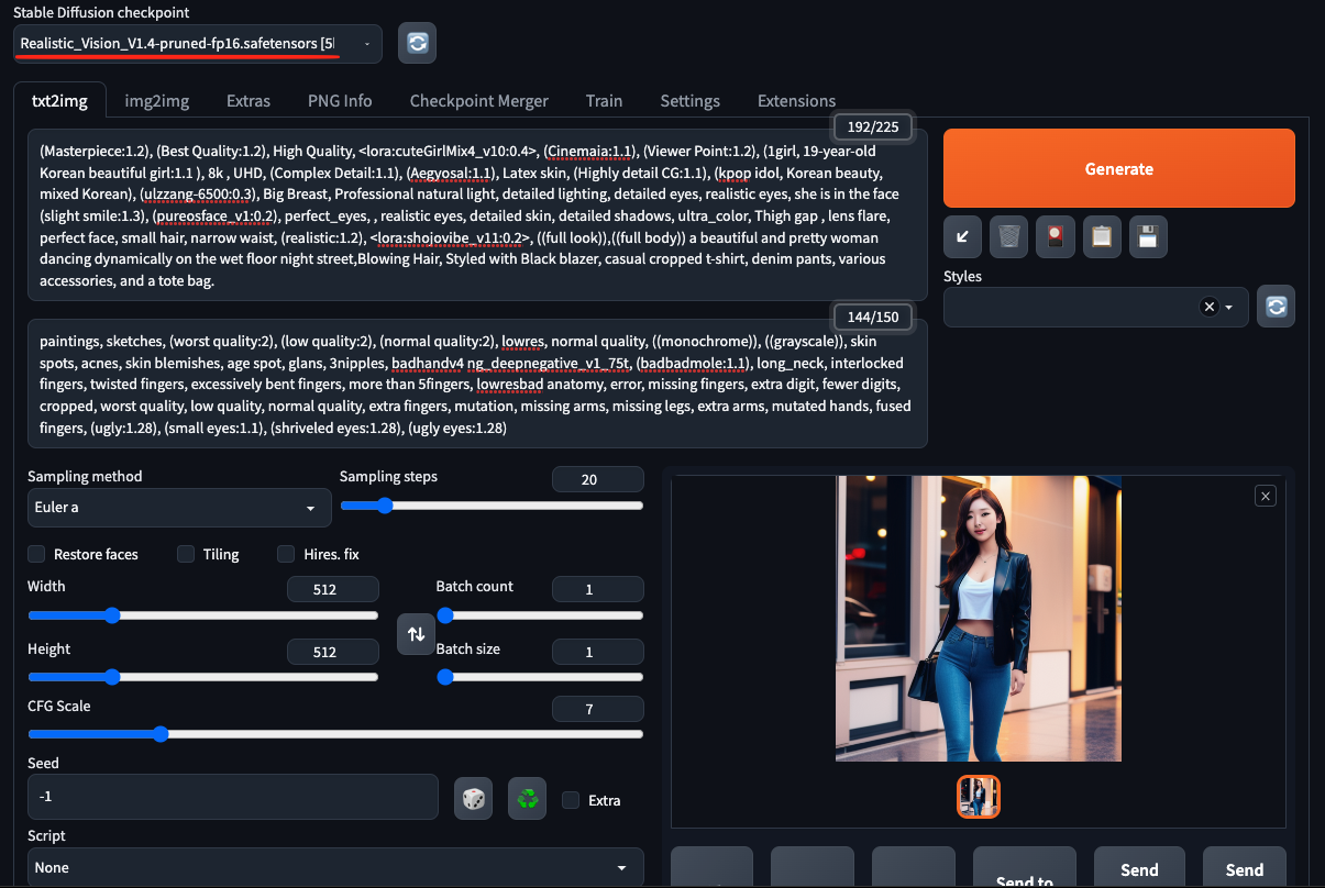 Realistic_Vision_V1.4..를 선택해서 생성해봅니다.